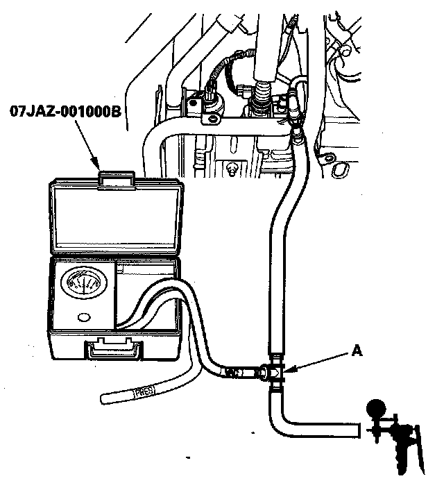 10. Disconnect the vacuum hose from the purge line (at the EVAP canister side), and connect a T-fitting (A) from the vacuum gauge and the vacuum pump/gauge, 0 - 30 in.Hg, to the hose as shown.
