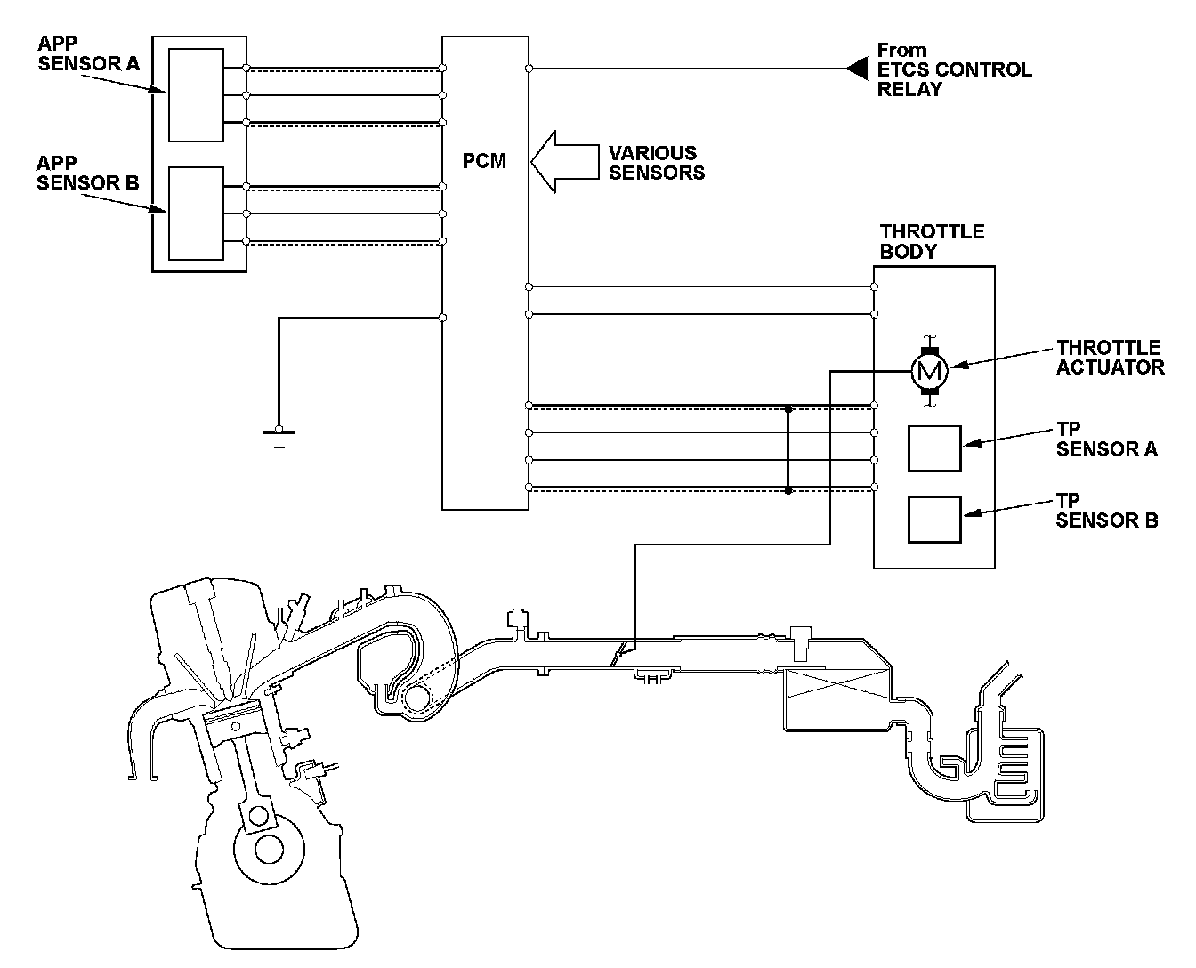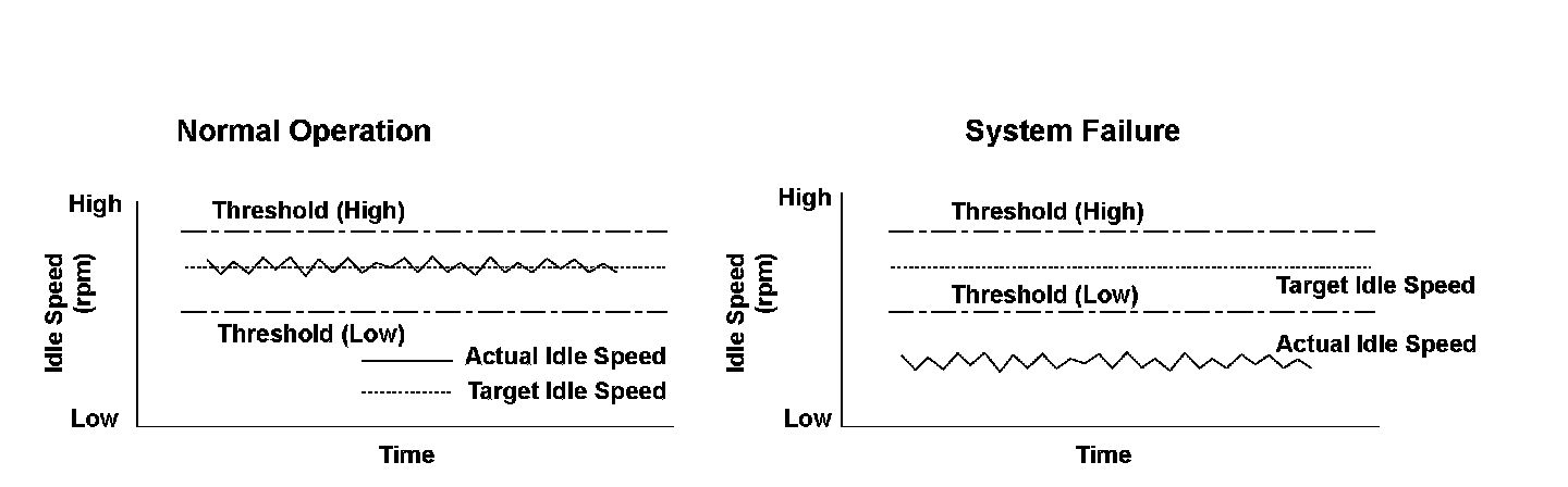 A target idle speed that meets the engine operating conditions (coolant temperature, A/C ON or OFF, etc.) is stored in the power train control module (PCM). The PCM monitors and controls the idle speed so that the actual idle speed is equal to the target idle speed. If the actual idle speed varies beyond a specified value from the target speed over a certain period of time, the PCM detects a Malfunction in the idle speed control system and a DTC is stored.