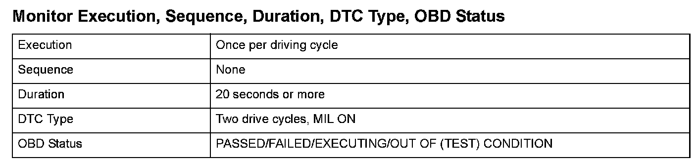 Monitor Execution, Sequence, Duration, DTC Type, OBD Status