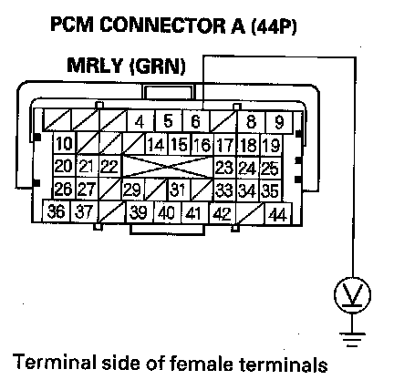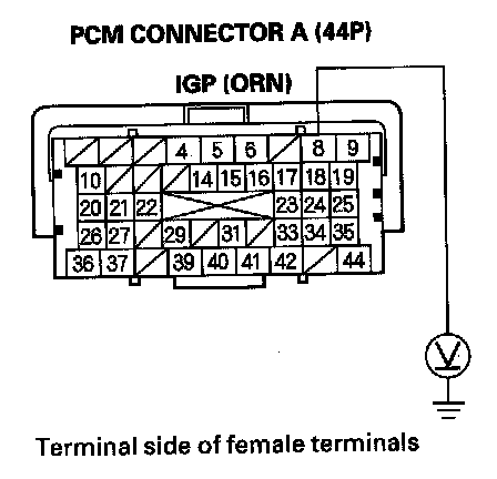 14. Measure voltage between PCM connector terminal A8 and body ground.