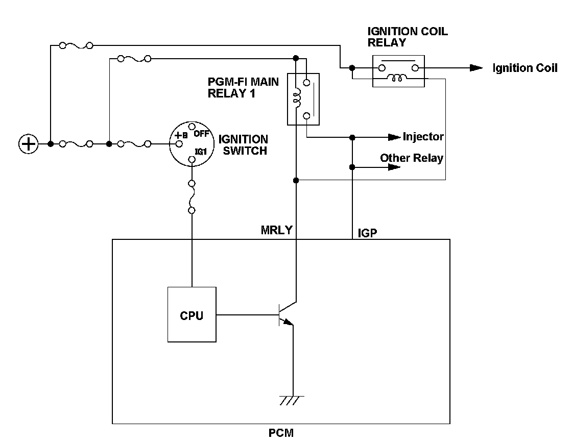 During a normal PCM shut down, the shut down process is executed by the CPU, PGM-FI main relay 1 is turned off, and the voltage to the PCM is turned off to shut down the PCM. When the voltage to the PCM is turned off and the PCM shuts down without the normal shut down procedure, a Malfunction in the PGM-FI main relay 1 control circuit is detected and a DTC is stored.