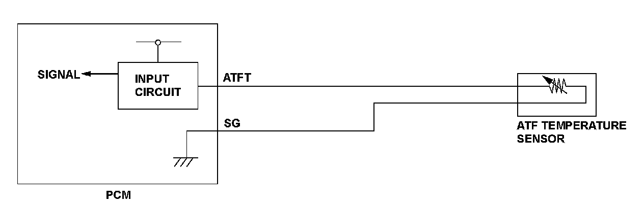 The ATF temperature sensor is a thermistor type sensor whose resistance changes according to the change in ATF temperature. The power train control module (PCM) sends a 5 V reference voltage to the grounded sensor through a pull-up resistor. When the ATF temperature is low, the sensor resistance increases and the PCM detects a high signal voltage. As the ATF temperature rises, the sensor resistance decreases and the PCM detects a low signal voltage.