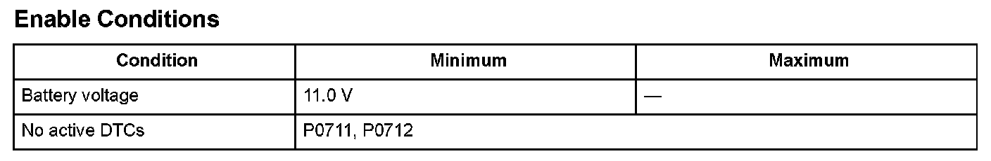 When the ATF temperature sensor signal voltage to the PCM is above the specification, indicating that the temperature is under the specification (open), a Malfunction is detected and a DTC is stored.