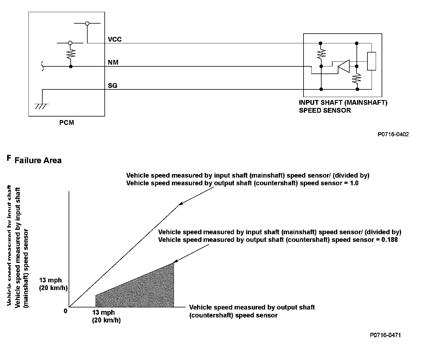 The input shaft (mainshaft) speed sensor is attached to the outside of the transmission housing. The input shaft (mainshaft) speed sensor generates a pulsing signal according to the speed of the input shaft (mainshaft) idler gear on the input shaft (mainshaft). Using that signal, the power train control module (PCM) determines the speed of the input shaft (mainshaft). If no pulses occur with the input shaft (mainshaft) rotating, the PCM detects a Malfunction that may be caused by an open, a temporary open, or a short to ground. Based on the velocity ratio measured by the output shaft (countershaft) speed sensor and the input shaft (mainshaft) speed sensor, a Malfunction is detected and a DTC is stored.