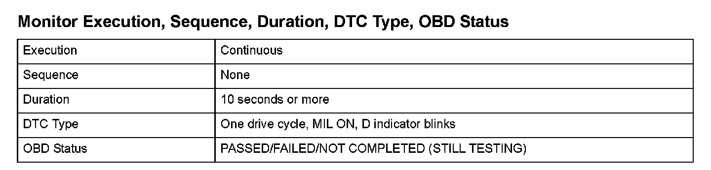 Monitor Execution, Sequence, Duration, DTC Type, OBD Status