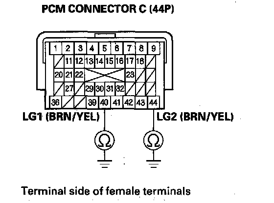 9. Check for continuity between PCM connector terminals C40 and body ground, and between C44 and body ground.