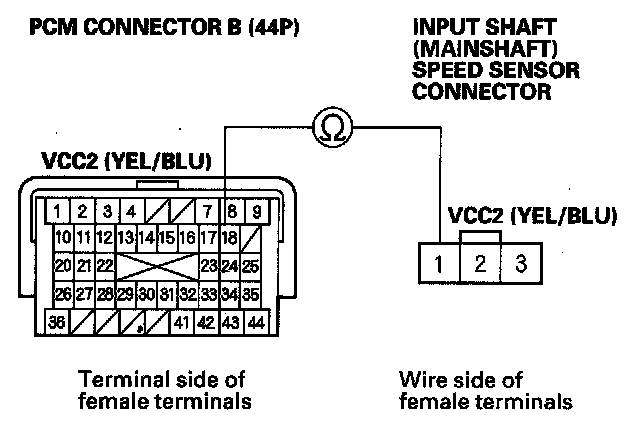 16. Check for continuity between PCM connector terminal B18 and input shaft (mainshaft) speed sensor connector terminal No. 1.