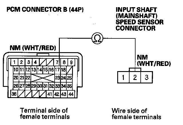 31. Check for continuity between PCM connector terminal B17 and input shaft (mainshaft) speed sensor connector terminal No. 2.