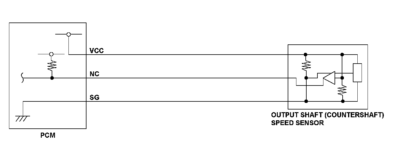 The output shaft (countershaft) speed sensor is attached to the transmission housing to sense output shaft (countershaft) revolutions. The power train control module (PCM) determines the vehicle speed according to the signal from the output shaft (countershaft) speed sensor to the control units. If no signal from the output shaft (countershaft) speed sensor is received for a set time, the PCM detects a Malfunction and a DTC is stored.