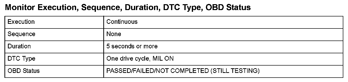 Monitor Execution, Sequence, Duration, DTC Type, OBD Status