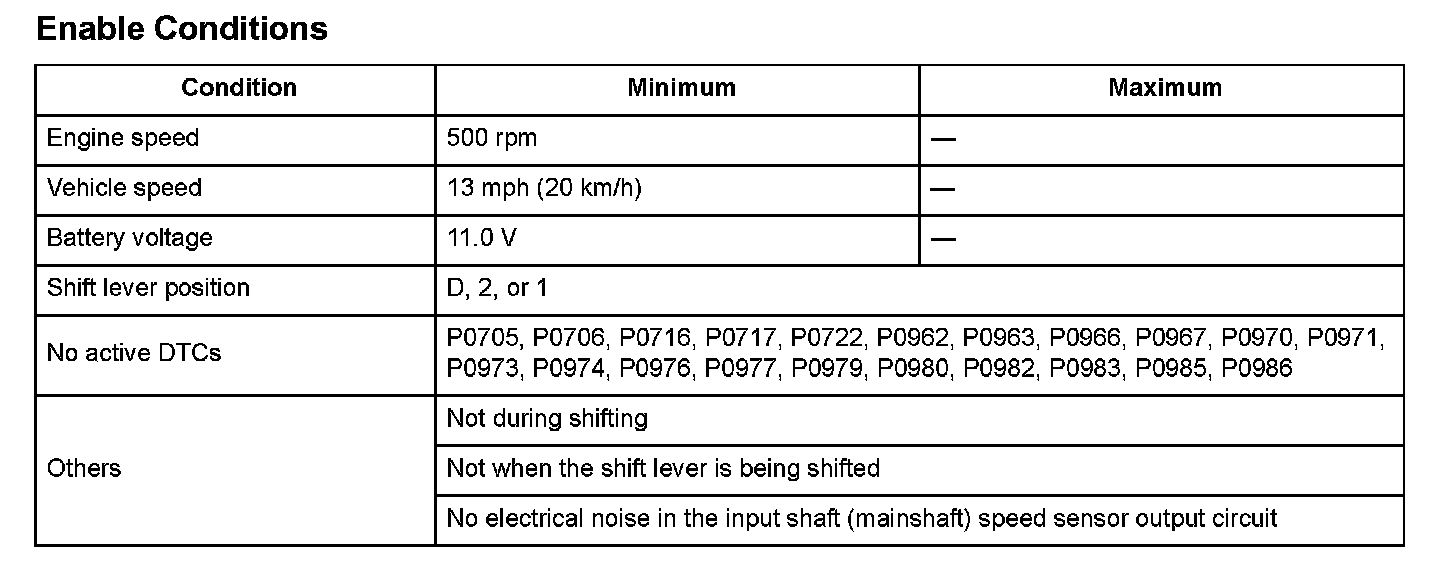 The vehicle speed measured by the input shaft (mainshaft) speed sensor/(divided by) the vehicle speed measured by the output shaft (countershaft) speed sensor > 5.0 for at least 10 seconds.