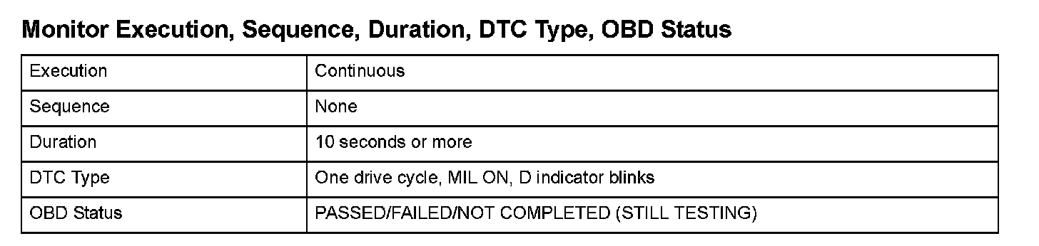 Monitor Execution, Sequence, Duration, DTC Type, OBD Status
