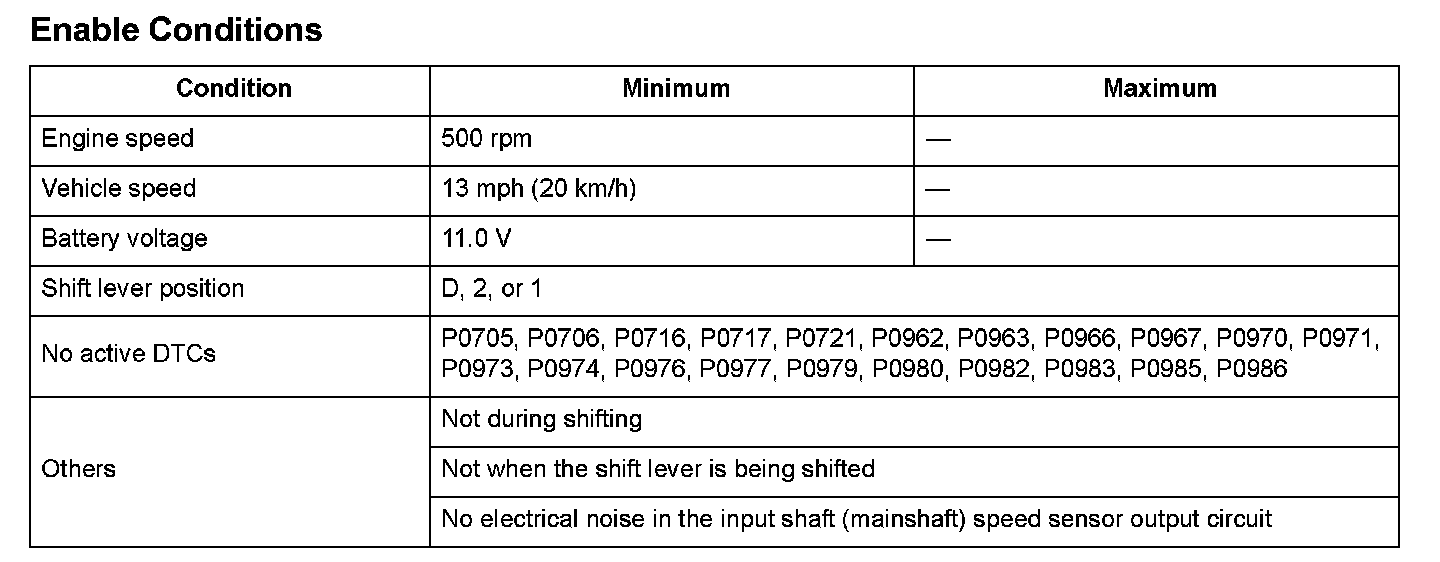When the vehicle speed measured by the input shaft (mainshaft) speed sensor is 13 mph (20 km/h) or more, the vehicle speed measured by the output shaft (countershaft) speed sensor is 1 mph (2 km/h) or less for at least 10 seconds.