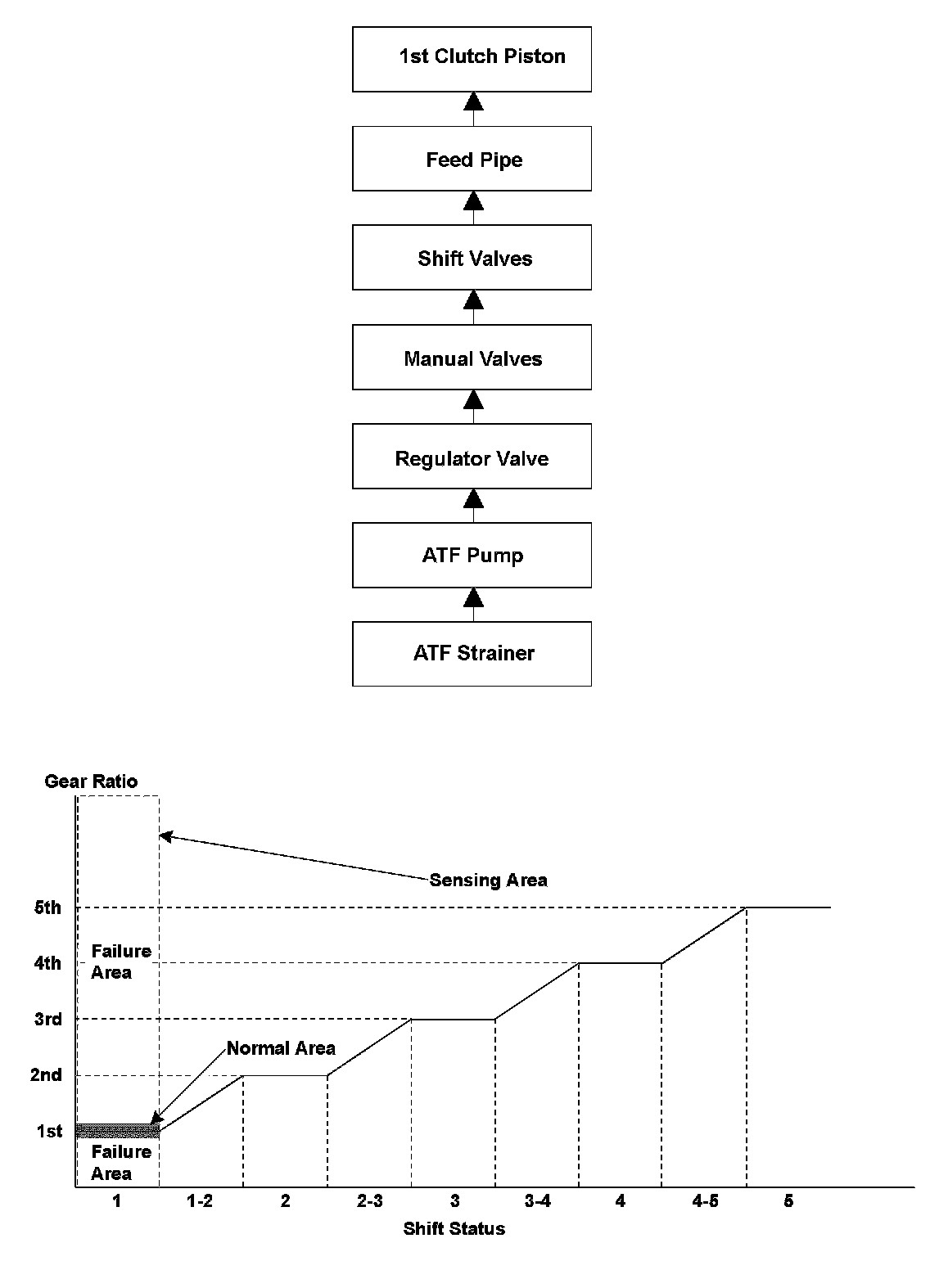 To engage 1st gear, line pressure is supplied to the 1st clutch piston, engaging the 1st clutch, and the secondary shaft and the secondary shaft 1st gear are connected and revolve together. Hydraulic pressure is supplied to the 1st clutch through the ATF strainer -> the ATF pump -> the regulator valve -> the manual valve -> the shift valves -> the feed pipe -> 1st clutch piston. (A shift valve failure in the supply route above is detected by the Malfunction detection of each shift solenoid valve.) The power train control module (PCM) computes the ratio of the input shaft (mainshaft) speed to the output shaft (countershaft) speed. When the ratio is not the 1st gear ratio, it is detected as a Malfunction of the hydraulic circuit or the 1st clutch, and a DTC is stored.