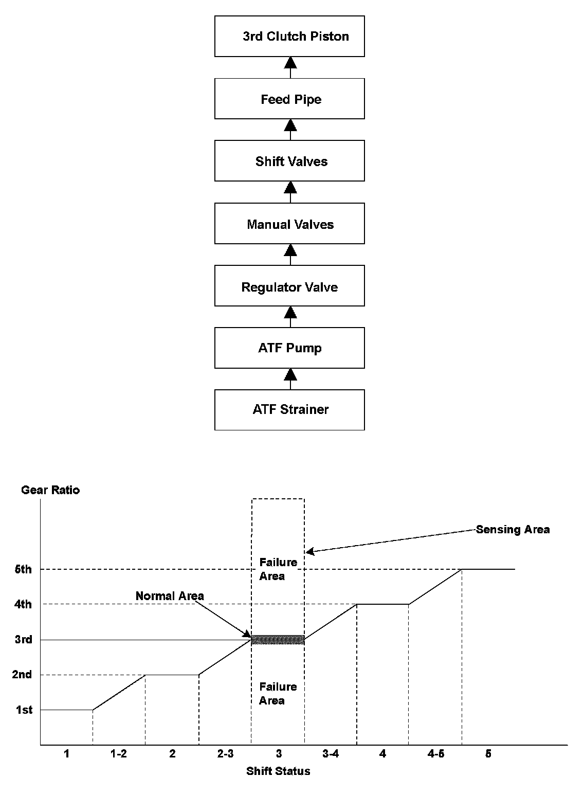 To engage 3rd gear, line pressure is supplied to the 3rd clutch piston, the 3rd clutch is engaged, and the secondary shaft and the secondary shaft 3rd gear are connected and revolve together. Hydraulic pressure is supplied to the 3rd clutch through the ATF strainer -> the ATF pump -> the regulator valve -> the manual valve -> the shift valves -> the feed pipe -> 3rd clutch piston. (The shift valve failure in the supplying route above is detected by the Malfunction detection of each shift solenoid valve.) The power train control module (PCM) computes the ratio of the mainshaft speed to the countershaft speed. When the ratio is not the 3rd gear ratio, it is detected as a Malfunction of the hydraulic circuit or the 3rd clutch, and a DTC is stored.