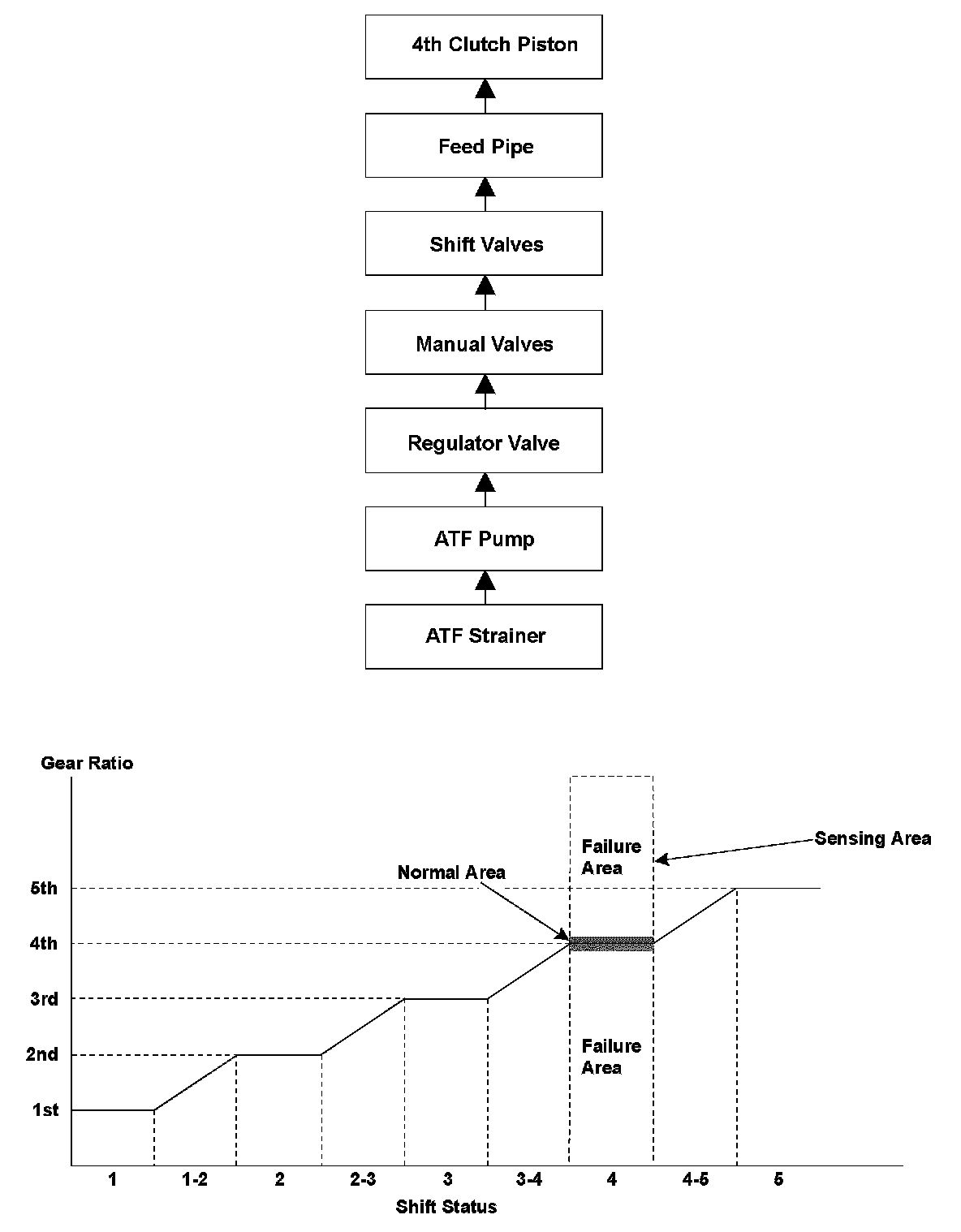 To engage 4th gear, line pressure is supplied to the 4th clutch piston, engaging the 4th clutch, and the input shaft (mainshaft) and the input shaft (mainshaft) 4th gear are connected and revolve together. Hydraulic pressure is supplied to the 4th clutch through the ATF strainer -> the ATF pump -> the regulator valve -> the manual valve -> the shift valves -> the feed pipe -> 4th clutch piston. (A shift valve failure in the supply route above is detected by the Malfunction detection of each shift solenoid valve.) The power train control module (PCM) computes the ratio of the input shaft (mainshaft) speed to the output shaft (countershaft) speed. When the ratio is not the 4th gear ratio, it is detected as a Malfunction of the hydraulic circuit or the 4th clutch, and a DTC is stored.