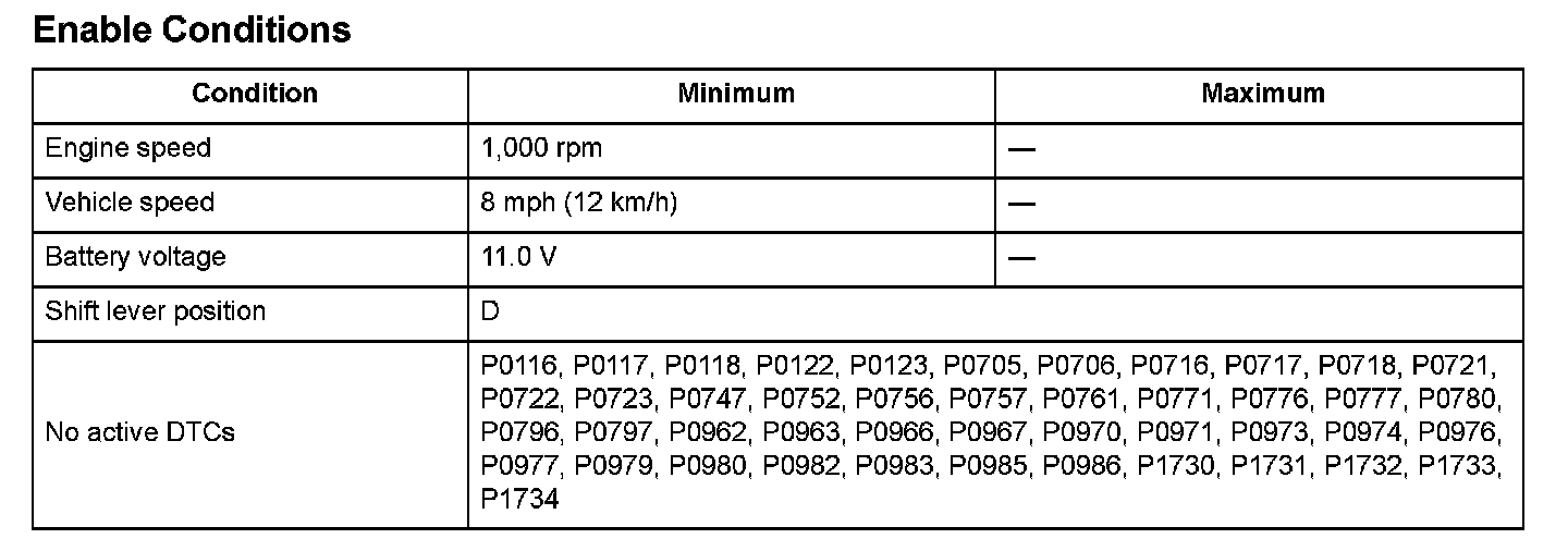 Start the engine, shift to D position, and drive the vehicle at a speed of 8 mph (12 km/h) or more for at least 12 seconds in 4th gear.