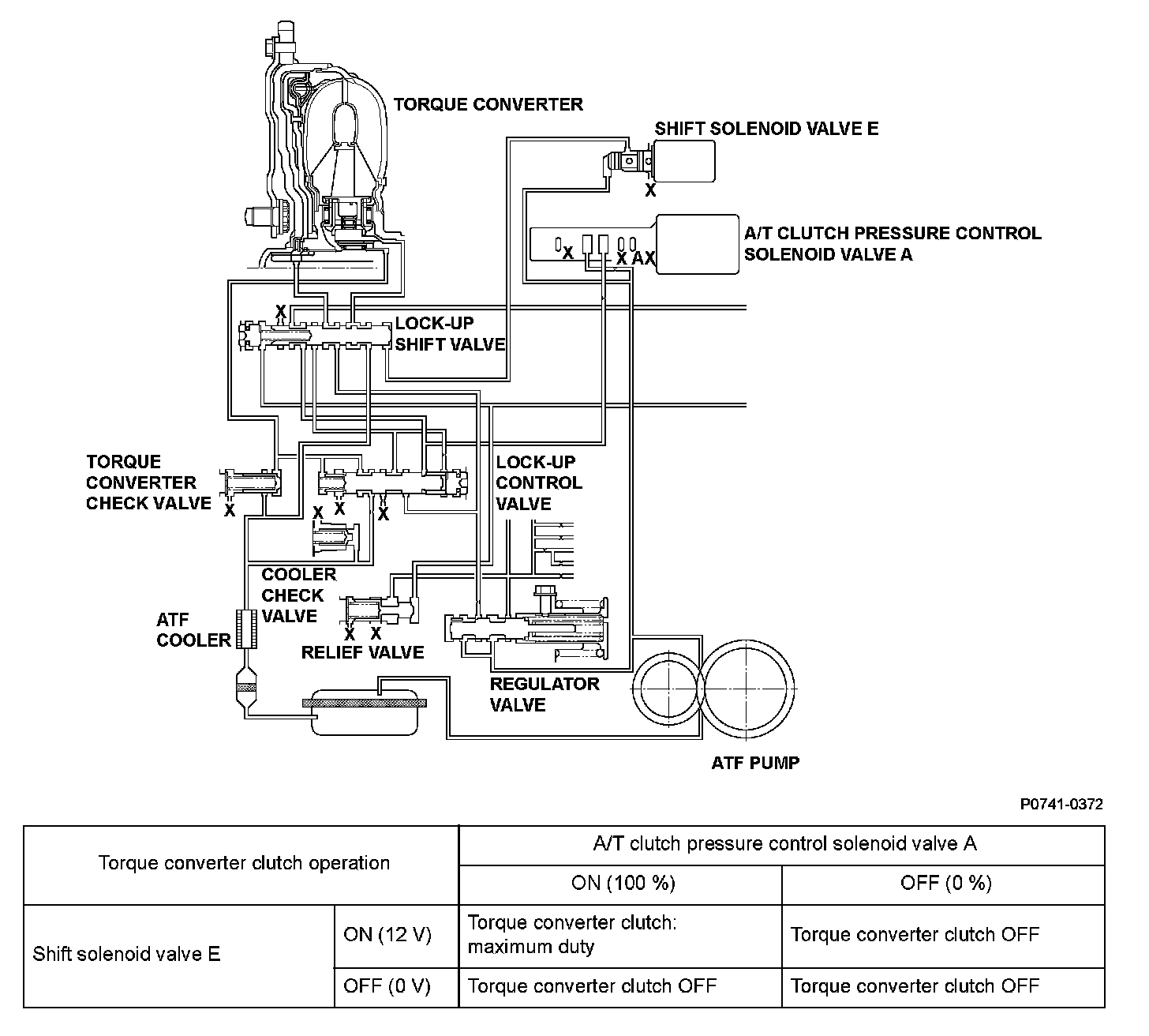 The power transfer capacity of the torque converter clutch is controlled by the balance of automatic transmission fluid (ATF) supplied to and discharged from the torque converter. When hydraulic pressure is applied internally, the torque converter clutch turns ON, and when hydraulic pressure is applied from the back pressure side, the lock-up clutch turns OFF. As the hydraulic pressure from the internal pressure side increases, the power transfer capacity of the torque converter clutch increases. The direction of hydraulic pressure supply is switched by shift solenoid valve E and the lock-up shift valve. ATF is supplied from the internal pressure side to shift solenoid valve E when the signal from the power train control module (PCM) is ON (12 V), and ATF is supplied from the back pressure side when it is OFF (0 V). The balance of internal pressure and back pressure is controlled by A/T clutch pressure control solenoid valve A and the lock-up control valve. A/T clutch pressure control solenoid valve A maximizes the power transfer capacity of the torque converter clutch when the signal from the PCM is ON (1 A), and it minimizes the power transfer capacity of the torque converter clutch when the signal from the PCM is OFF (0 A). If the ratio of engine speed and mainshaft speed is not about 1:1 while the PCM is issuing the command to turn shift solenoid valve E and A/T clutch pressure control solenoid valve A ON, the PCM detects a faulty lock-up control system and stores a DTC.
