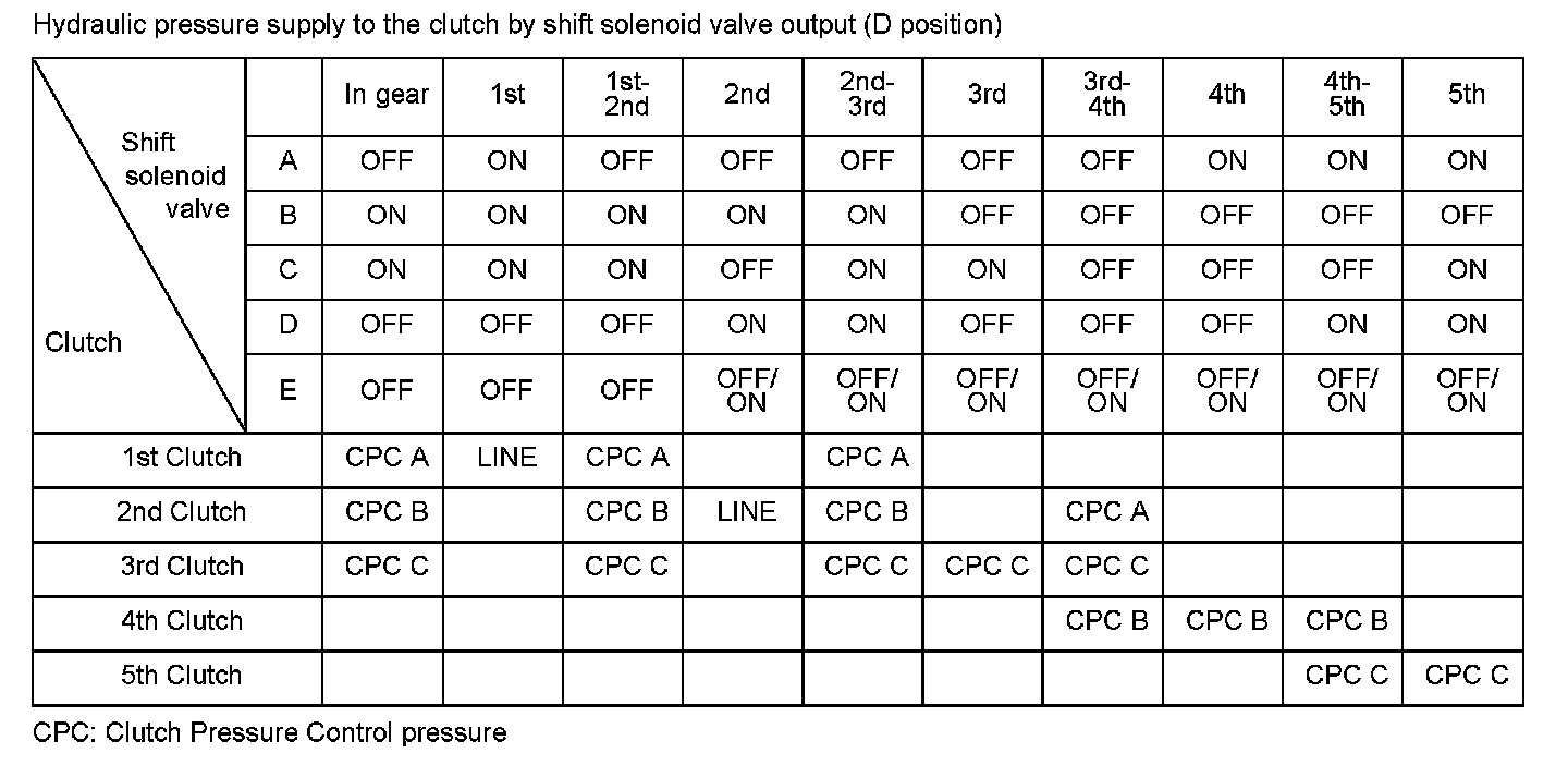 Hydraulic pressure to each clutch is controlled by the shift valve. The shift valve activates according to the ON/OFF status of shift solenoid valves A, B, C, D, and E. Hydraulic pressure supply in D position is shown above. The line pressure or the clutch pressure control pressure (CPC A, CPC B, or CPC C) is supplied to each clutch by the shift valve activated. The powertrain control module (PCM) computes the actual ratio of mainshaft and countershaft revolutions. If a difference between the actual ratio and the commanded gear occurs when shifting to each gear position, a Malfunction in A/T clutch pressure control solenoid valve A or the hydraulic system is detected and a DTC is stored.
