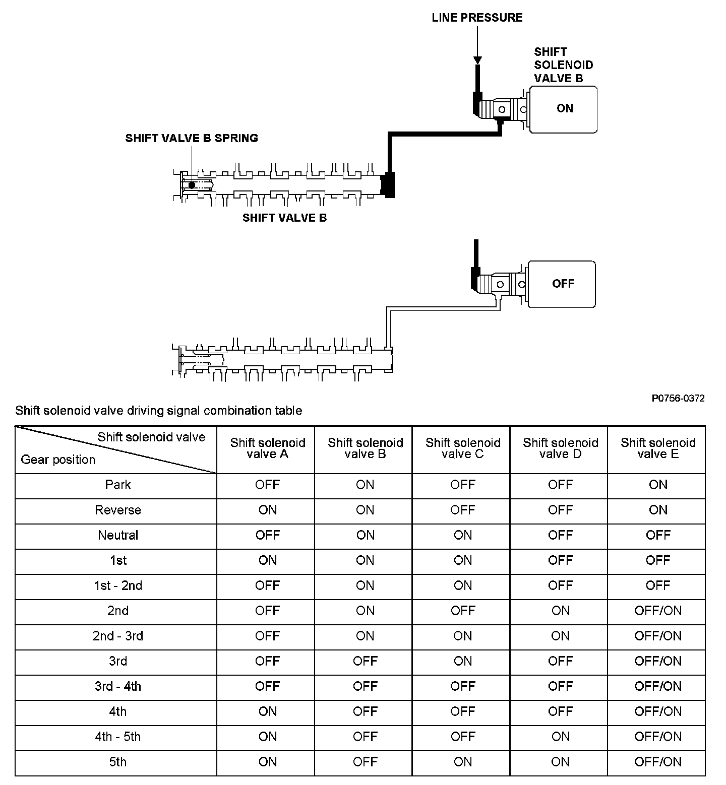 Shift solenoid valve B is installed in the transmission housing. It is controlled by the ON/OFF signal from the power train control module (PCM) to apply line pressure to shift valve B. The signal from the PCM is output to apply clutch pressure control pressure to the proper gear change clutch according to the gear change schedule. When the signal to shift solenoid valve B from the PCM is OFF, and line pressure is discharged, shift valve B is inactive. When the signal to shift solenoid valve B from the PCM is ON, and line pressure is applied to shift valve B, it operates against the shift valve B spring. The PCM monitors the mainshaft speed and the countershaft speed at the gear change determined by the shift schedule. When an improper gear ratio is output compared to the predetermined gear change mode, a shift solenoid valve B ON failure is detected and a DTC is stored.