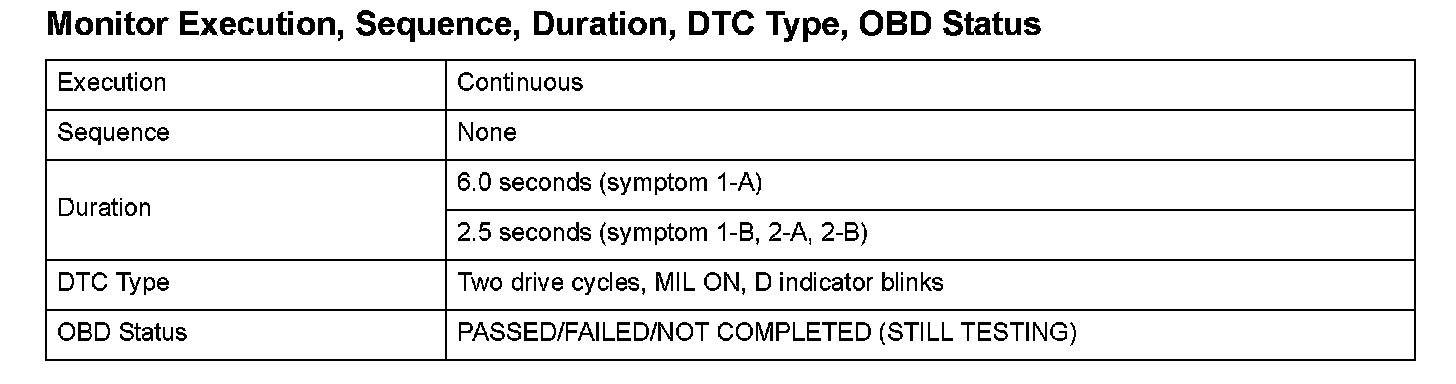 Monitor Execution, Sequence, Duration, DTC Type, OBD Status