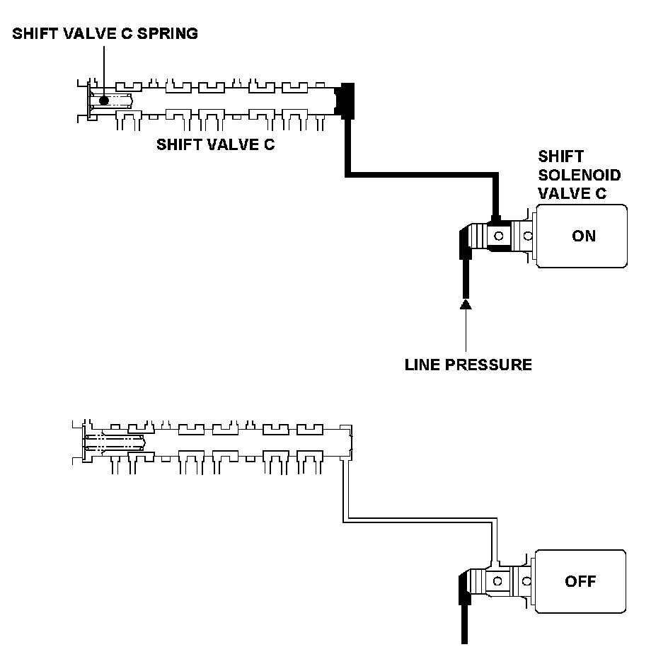 Shift solenoid valve C is installed in the transmission housing. It is controlled by the ON/OFF signal from the power train control module (PCM) to apply line pressure to shift valve C. The signal from the PCM is output to apply clutch pressure control pressure to the proper gear change clutch according to the gear change schedule. When the signal to shift solenoid valve C from the PCM is OFF, line pressure is discharged, and shift valve C is inactive. When the signal to shift solenoid valve C from the PCM is ON, line pressure is applied to shift valve C, and it operates against the shift valve C spring. The PCM monitors the mainshaft speed and the countershaft speed at the gear change determined by the shift schedule. When an improper gear ratio is output compared to the predetermined gear change mode, a shift solenoid valve C OFF failure is detected and a DTC is stored.