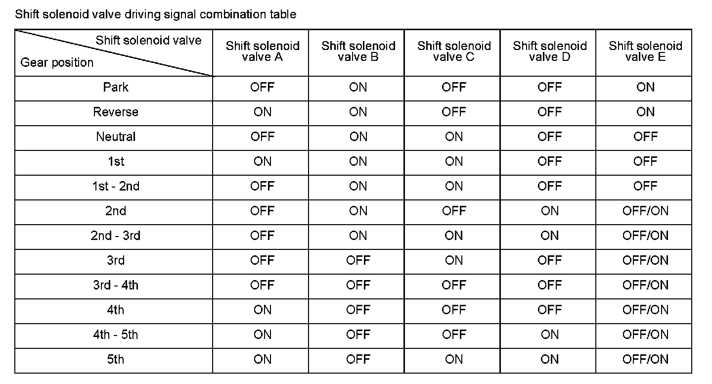 Shift solenoid valve E is installed in the transmission housing. It is controlled by the ON/OFF signal from the power train control module (PCM) to apply line pressure to shift valve E. The signal from the PCM is output to apply clutch pressure control pressure to the proper gear change clutch according to the gear change schedule. When the signal to shift solenoid valve E from the PCM is OFF, line pressure is discharged, and shift valve E is inactive. When the signal to shift solenoid valve E from the PCM is ON, line pressure is applied to shift valve E, and it operates against the shift valve E spring. The PCM monitors the mainshaft speed and the countershaft speed at the gear change determined by the shift schedule. When an improper gear ratio is output compared to the predetermined gear change mode, a shift solenoid valve E OFF failure is detected and a DTC is stored.