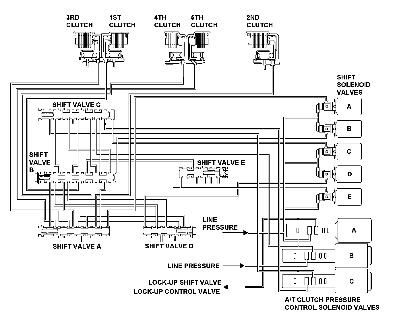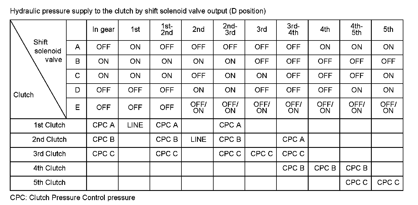 Hydraulic pressure to each clutch is controlled by the shift valve. The shift valve activates according to the ON/OFF status of shift solenoid valves A, B, C, D, and E. Hydraulic pressure supply in D position is shown above. The line pressure or the clutch pressure control pressure (CPC A, CPC B, or CPC C) is supplied to each clutch by the shift valve activated. The powertrain control module (PCM) computes the actual ratio of mainshaft and countershaft revolutions. If a difference between the actual ratio and the commanded gear occurs when shifting to each gear position, a Malfunction in A/T clutch pressure control solenoid valve C or the hydraulic system is detected and a DTC is stored.
