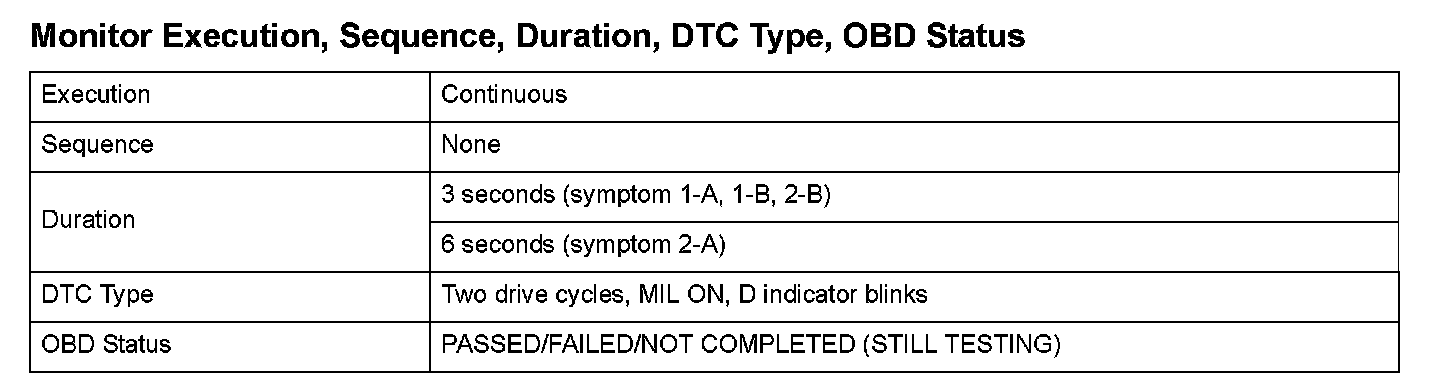 Monitor Execution, Sequence, Duration, DTC Type, OBD Status