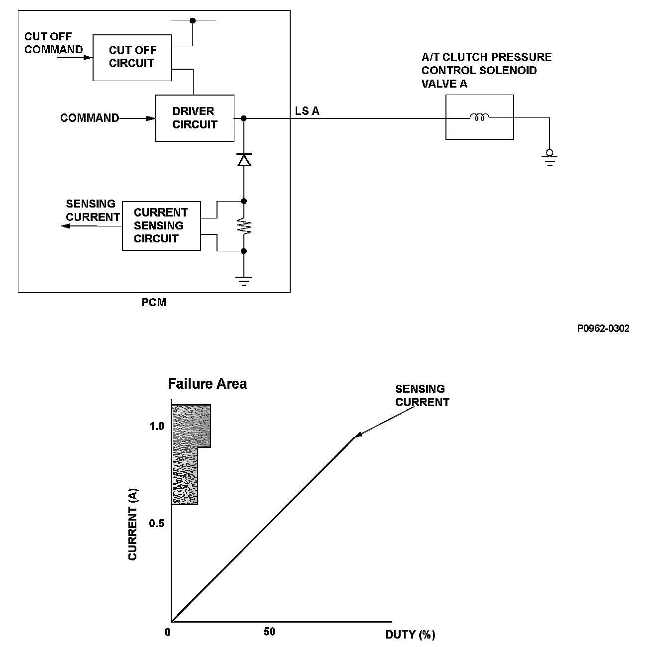 A/T clutch pressure control solenoid valve A is used for clutch pressure control and lock-up control. A spool in A/T clutch pressure control solenoid valve A pushes a valve according to the duty cycle that is controlled by the power train control module (PCM) to pressurize fluid so the hydraulic pressure is proportional to the current. The PCM measures the current flowing through A/T clutch pressure control solenoid valve A and uses feedback control to compensate for the difference between the actual current and the commanded one. If the measured current for the PCM output duty cycle is not within a specified range (open or short), a Malfunction is detected and a DTC is stored.