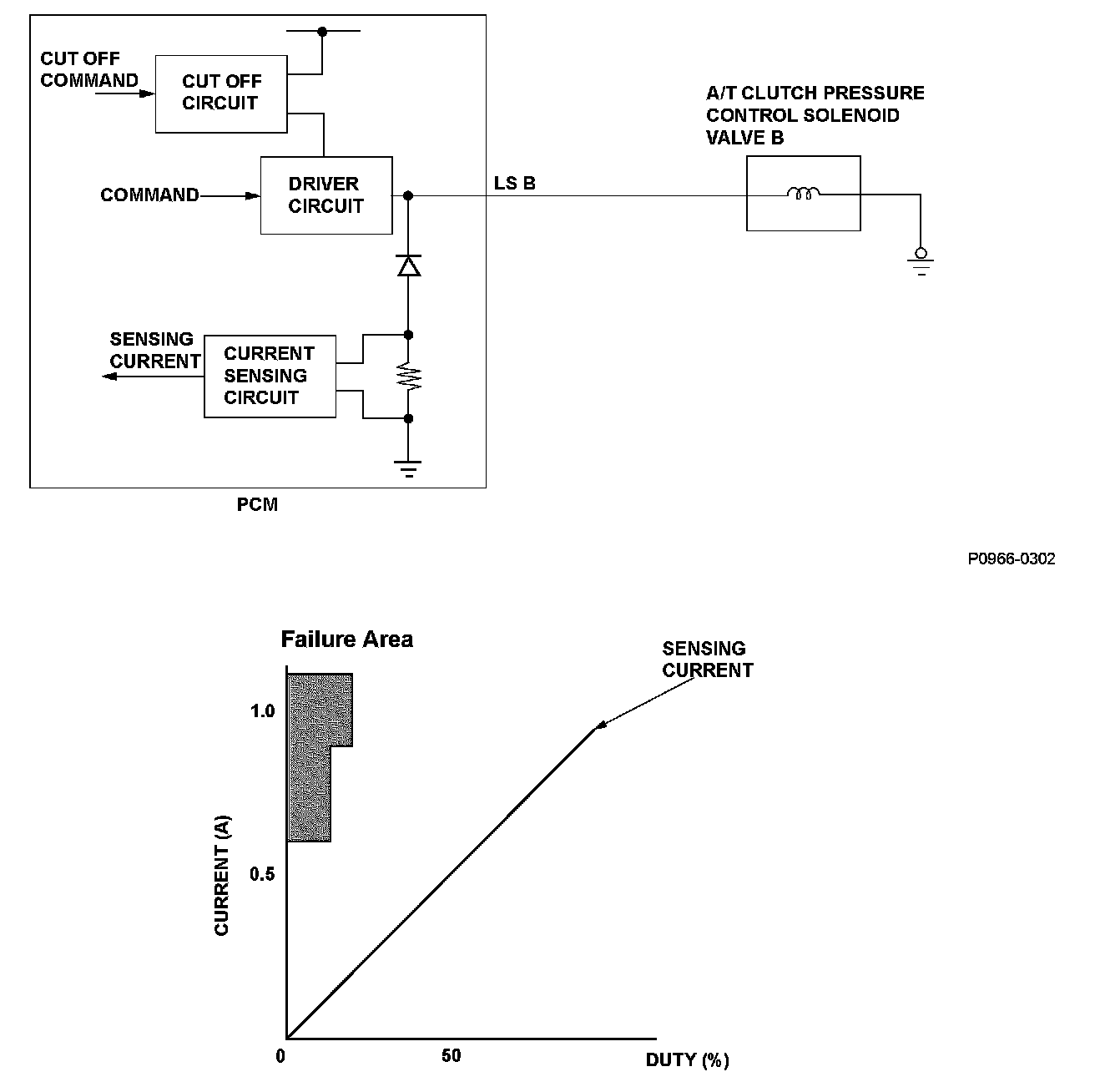 A/T clutch pressure control solenoid valve B is used for clutch pressure control. A spool in A/T clutch pressure control solenoid valve B pushes a valve according to the duty cycle that is controlled by the power train control module (PCM) so the hydraulic pressure is proportional to the current. The PCM measures the current flowing through A/T clutch pressure control solenoid valve B and uses feedback control to compensate for the difference between the actual current and the commanded one. If the measured current for the PCM output duty cycle is not within a specified range (open or short), a Malfunction is detected and a DTC is stored.