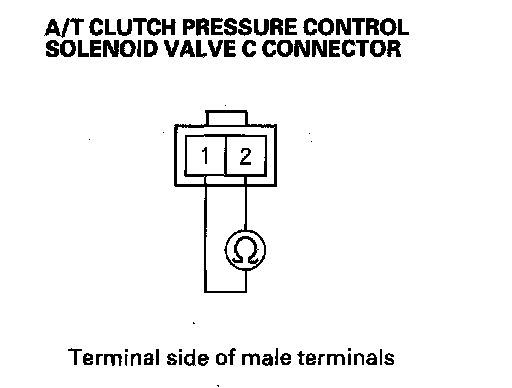 8. Measure the resistance between A/T clutch pressure control solenoid valve C connector terminals No. 1 and No. 2.