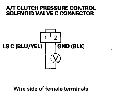 11. Measure the voltage between A/T clutch pressure control solenoid valve C connector terminals No. 1 and No. 2.