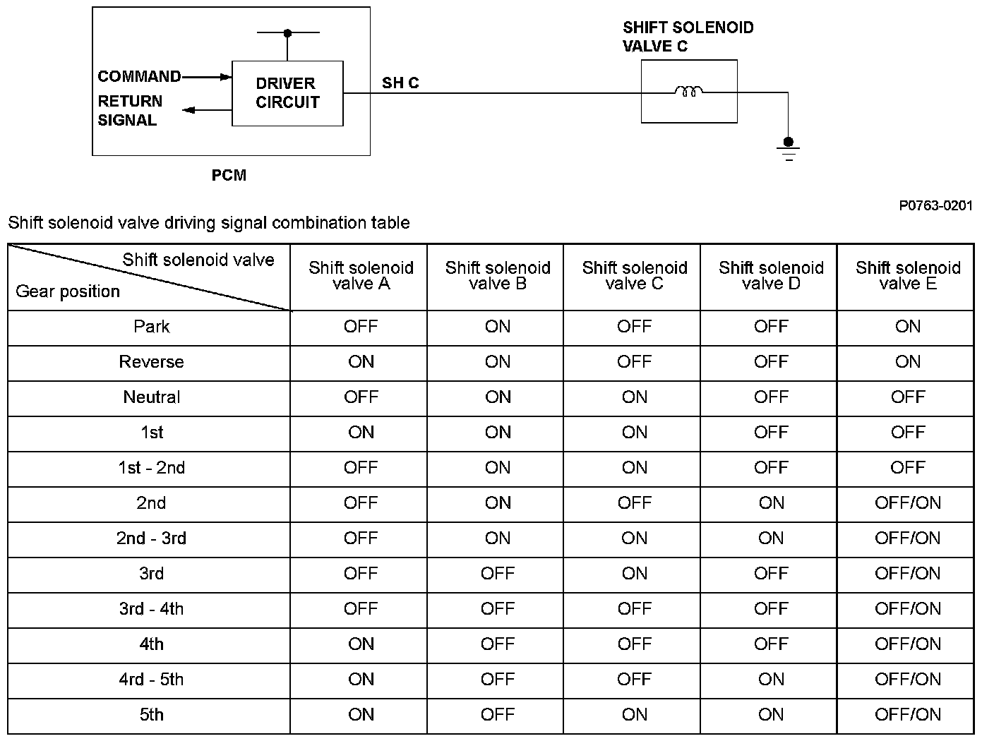 When shift solenoid valves A, B, C, D, and E are turned ON, the hydraulic pressure circuit opens. The hydraulic pressure circuit supplies/discharges hydraulic pressure to/from each clutch according to the combination of the ON/OFF status of those valves and the shift valves. The power train control module (PCM) commands the driver circuit to turn on the shift solenoid valve. The circuit diagnoses Malfunctions such as a circuit short or open, and sends back a return signal during the PCM's command. When the return signal does not match the PCM command, a Malfunction is detected by the PCM. The Malfunction is detected when the return signal does not match the PCM command to turn ON the shift solenoid valve, and a DTC is stored.