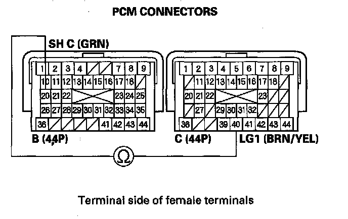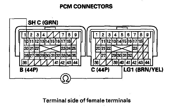 10. Measure the resistance between PCM connector terminals B20 and C40.
