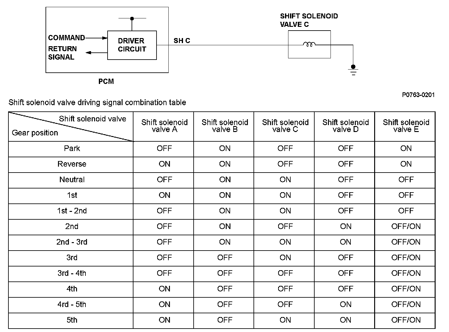 When shift solenoid valves A, B, C, D, and E are turned ON, the hydraulic pressure circuit opens. The hydraulic pressure circuit supplies/discharges hydraulic pressure to/from each clutch according to the combination of the ON/OFF status of those valves and the shift valves. The power train control module (PCM) commands the driver circuit to turn on the shift solenoid valve. The circuit diagnoses Malfunctions such as a circuit short or open, and sends back a return signal during the PCM's command. When the return signal does not match the PCM command, a Malfunction is detected by the PCM. The Malfunction is detected when the return signal does not match the PCM command to turn OFF the shift solenoid valve, and a DTC is stored.