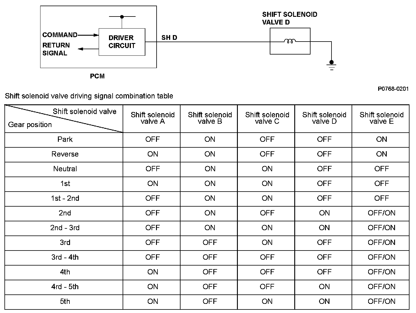 When shift solenoid valves A, B, C, D, and E are turned ON, the hydraulic pressure circuit opens. The hydraulic pressure circuit supplies/discharges hydraulic pressure to/from each clutch according to the combination of the ON/OFF status of those valves and the shift valves. The power train control module (PCM) commands the driver circuit to turn on the shift solenoid valve. The circuit diagnoses Malfunctions such as a circuit short or open, and sends back a return signal during the PCM's command. When the return signal does not match the PCM command, a Malfunction is detected by the PCM. The Malfunction is detected when the return signal does not match the PCM command to turn ON the shift solenoid valve, and a DTC is stored.