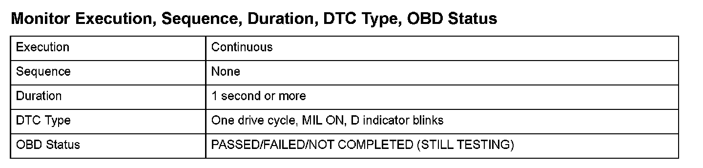Monitor Execution, Sequence, Duration, DTC Type, OBD Status