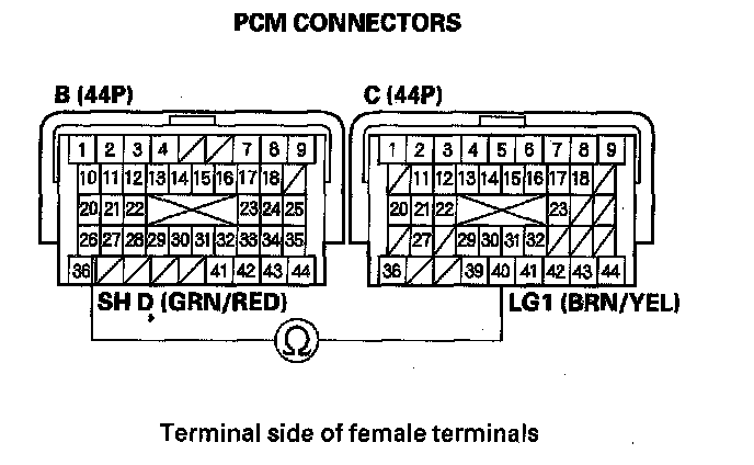 9. Disconnect PCM connectors B (44P) and C (44P).