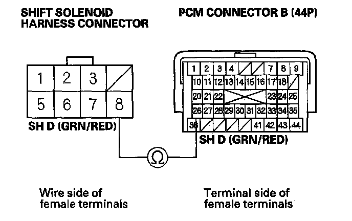 12. Check for continuity between PCM connector terminal B26 and shift solenoid harness connector terminal No. 8.