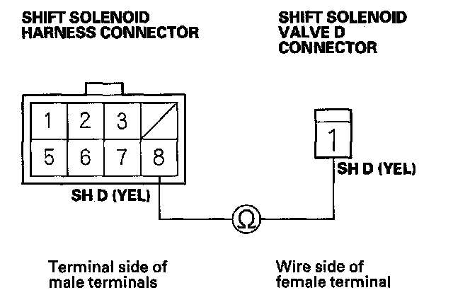 14. Check for continuity between shift solenoid harness connector terminal No. 8 and the shift solenoid valve D connector terminal.