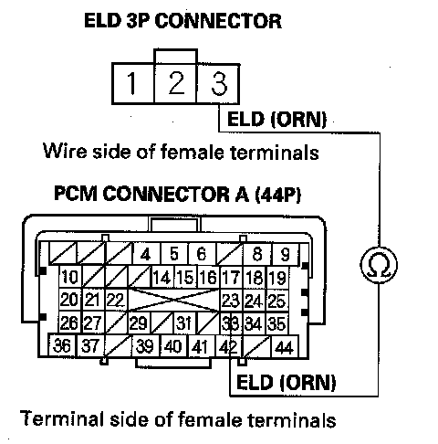 9. Check for continuity between ELD 3P connector terminal No. 3 and PCM connector terminal A23.
