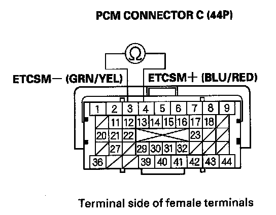 NO - Repair short in the wires between PCM C3 (ETCSM-line) and C4 (ETCSM+line), then go to step 7.