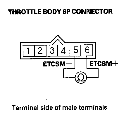 5. At the throttle body side, measure resistance between throttle body 6P connector terminals No. 5 and No. 6 with the throttle fully closed.