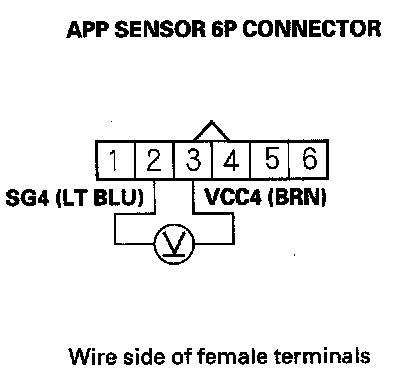 6. Measure voltage between APP sensor 6P connector terminals No. 2 and No. 3.