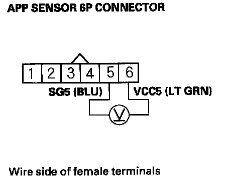 6. Measure voltage between APP sensor 6P connector terminals No. 5 and No. 6.