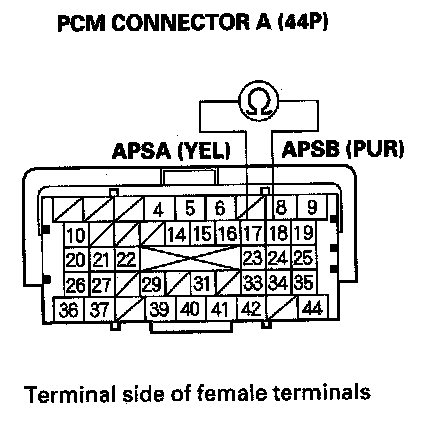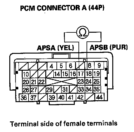YES - Repair short in the wires between PCM connector terminals A17 (APSA line) and A18 (APSB line), then go to step 14.