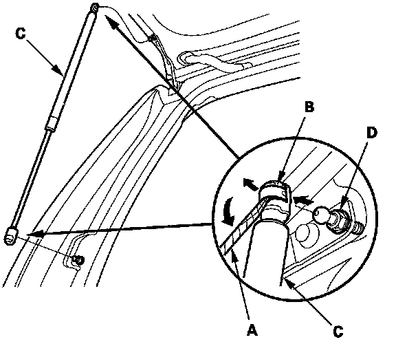 Tailgate Support Strut Replacement1. With the help of an assistant, use a flat-tip screwdriver (A) to pry the support strut clips (B) from each end of the support strut (C) at the tailgate and body, then release the support strut from the pivot bolts (D). Do not remove the clips from the support strut.