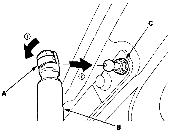 3. Set the clips (A) to the original position, then reattach the support strut (B) on the pivot bolts (C) by pushing the support strut onto the pivot.