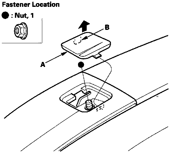 1. Using a trim tool, pry up on the front lid (A) of the front roof side trim to detach the hook (B), and remove the nut.